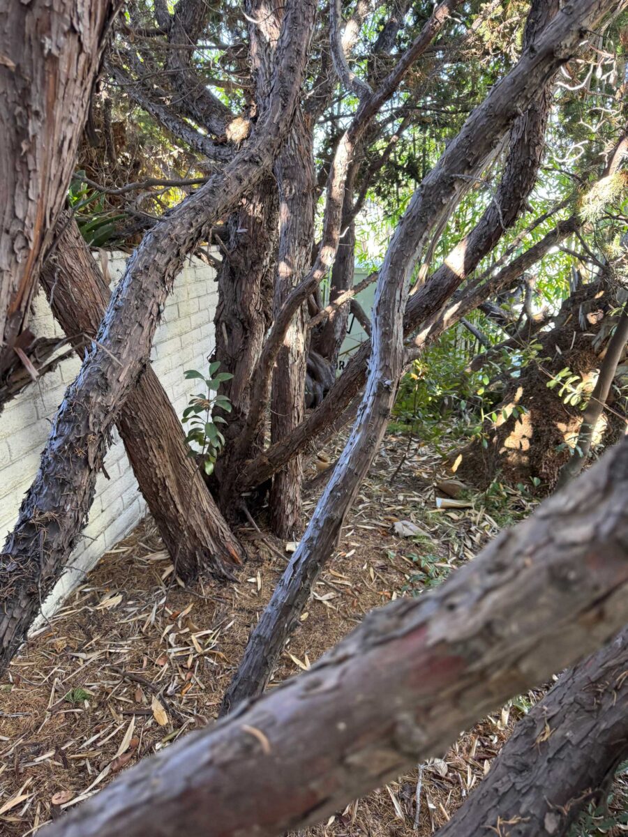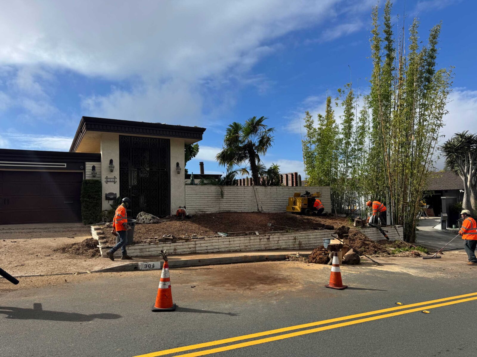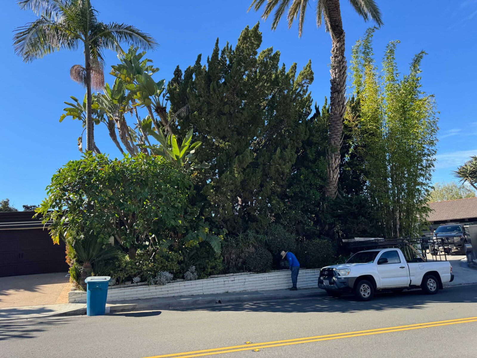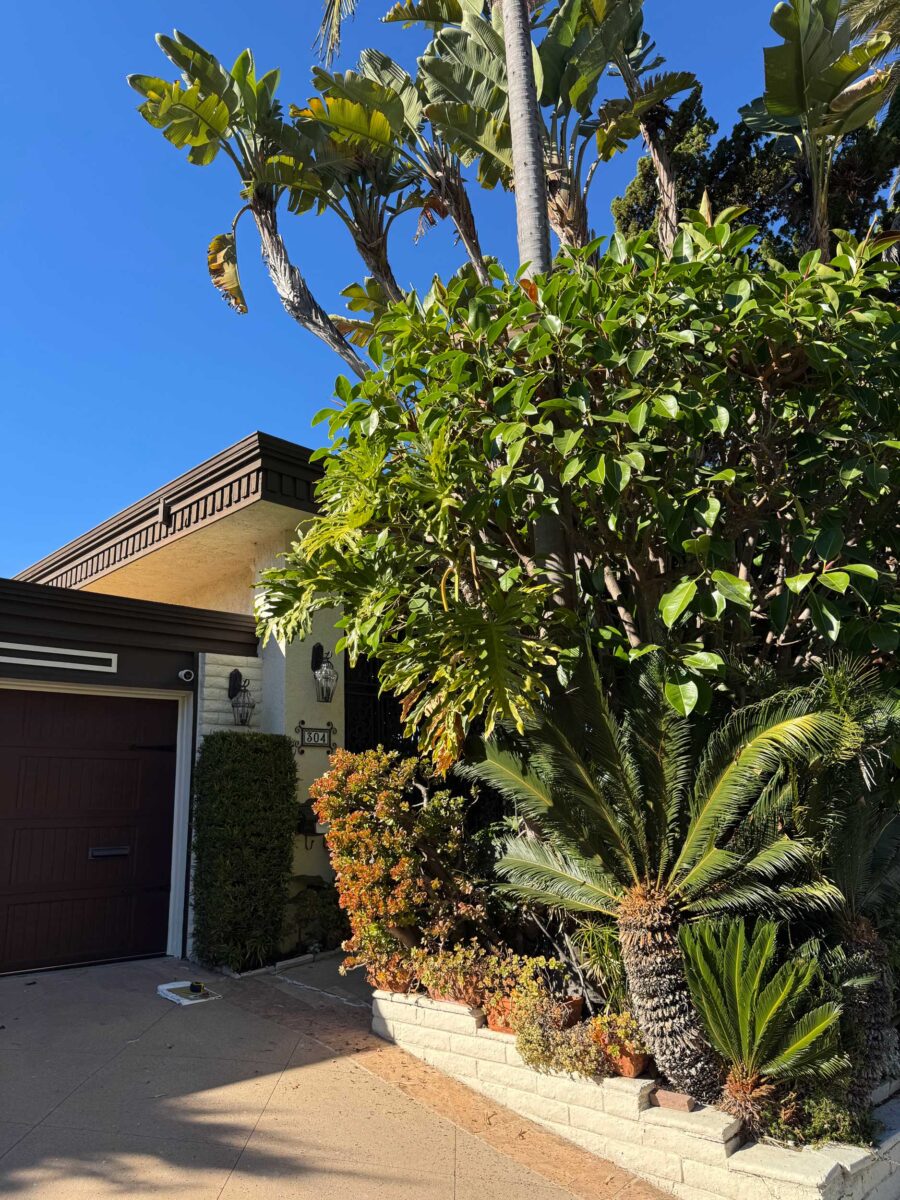 For decades, the front of the home was concealed by nearly forty years of unchecked growth, leaving the entryway hidden and the architecture overshadowed. Layers of multi-story bushes, succulents, palms, and segas dominated the space, creating a wall of vegetation that not only blocked the home’s character but also made the entry feel inaccessible.