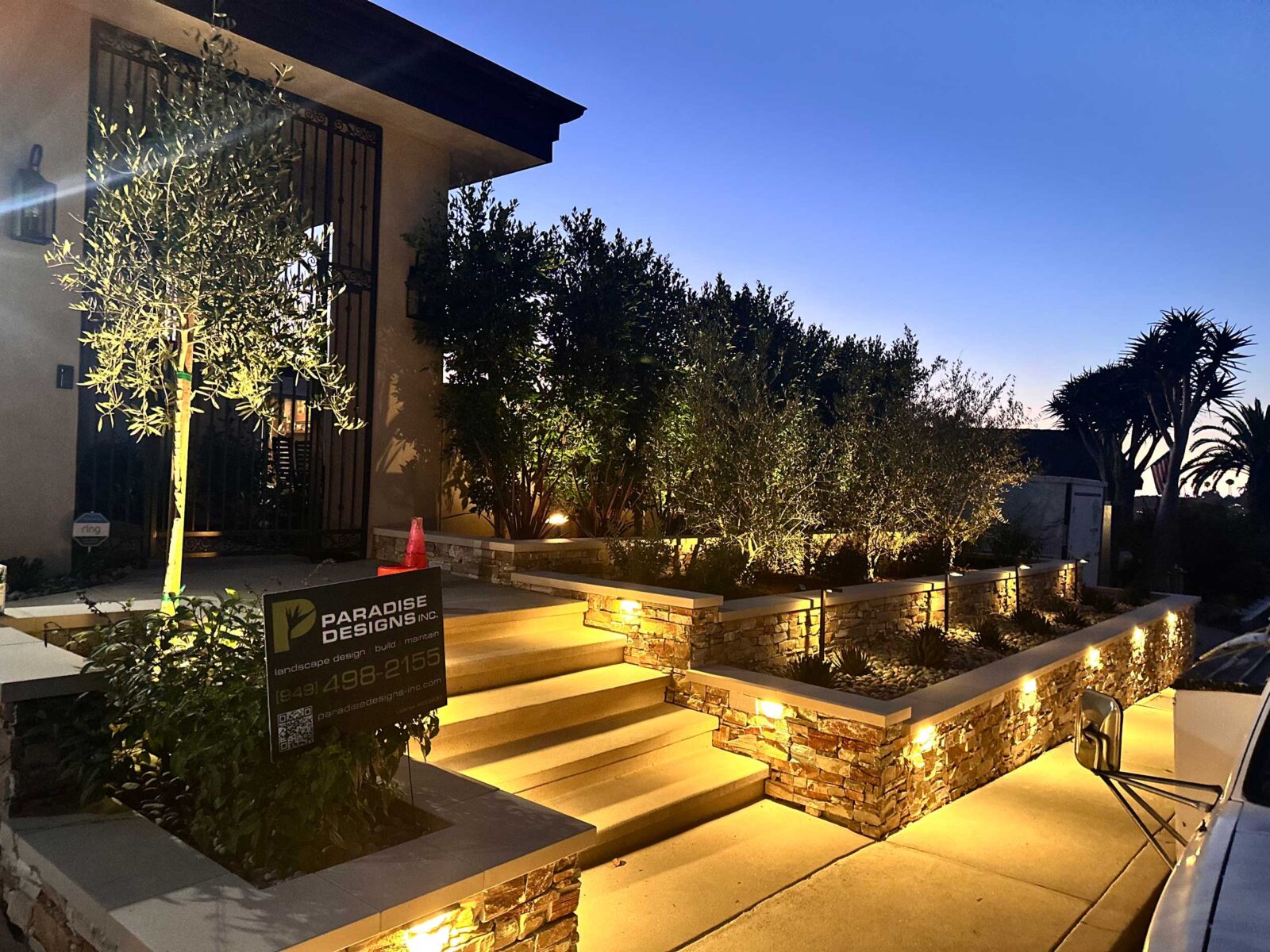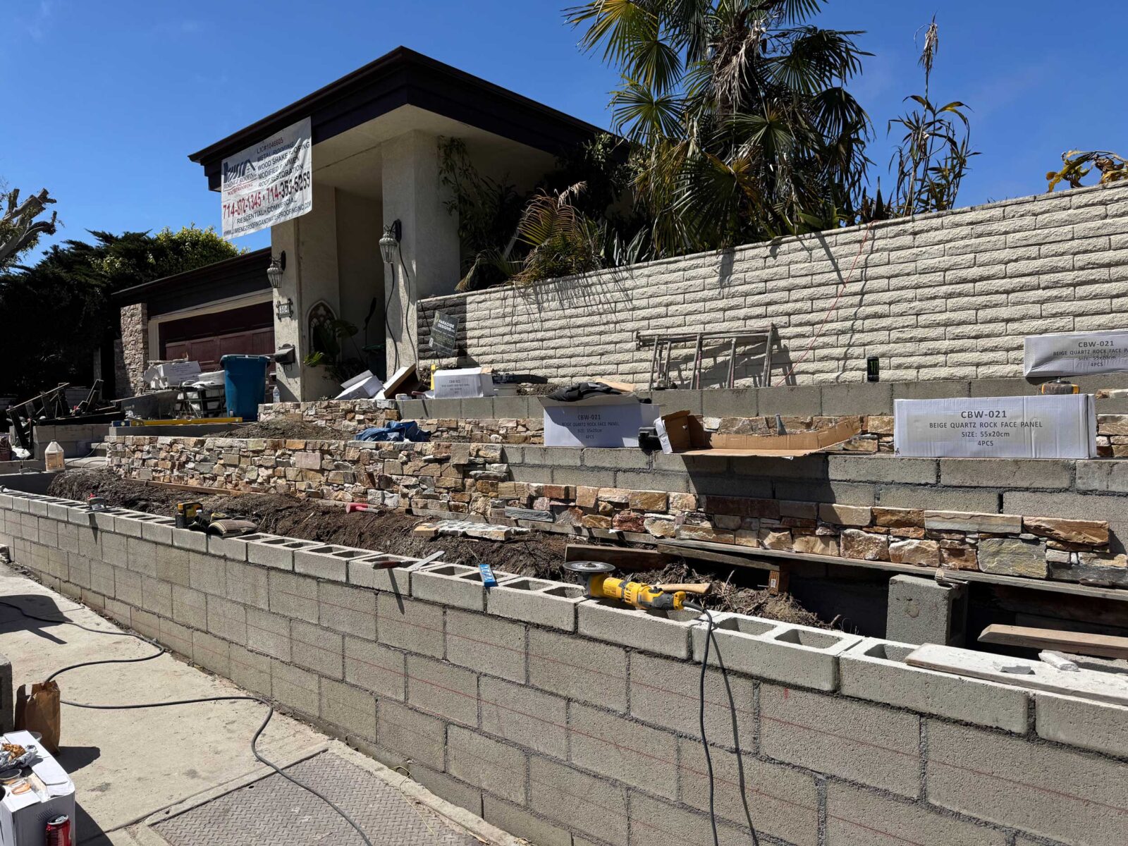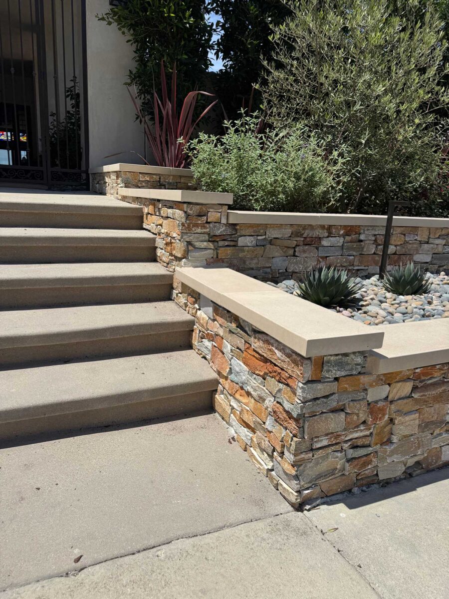 With the fresh canvas, we installed new retaining walls, finishing them with decorative stone for both durability and style. These walls were strategically tiered, creating levels enhancing the sightlines while opening space for a new set of stairs and a clear, welcoming entry.