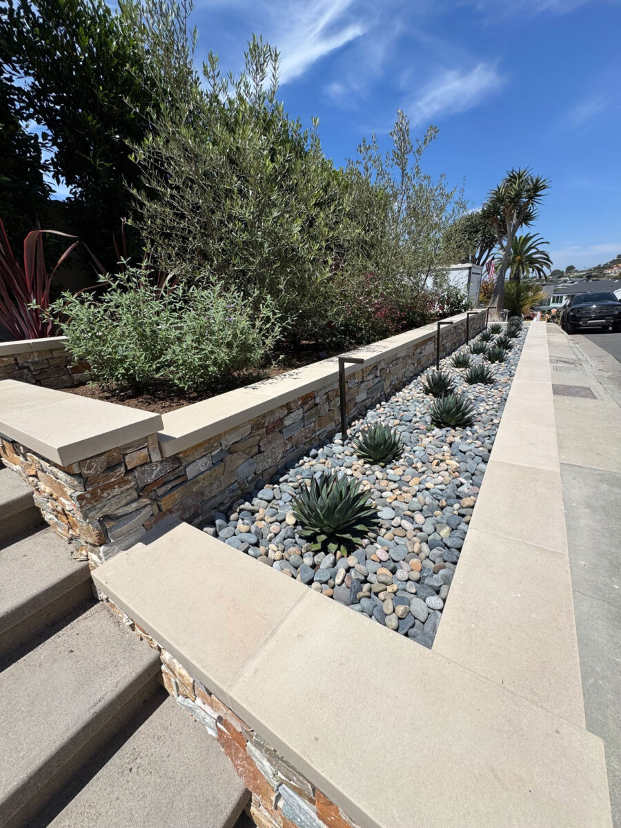The new walls and stairway also provided opportunities to utilize a thoughtful selection of plants. Replacing the dense growth, we curated plants that thrive in the Southern California climate and offer a refined, contemporary look. Agave was chosen for its sculptural qualities, sage for its texture and fragrance, and olive trees for their timeless beauty and shade.